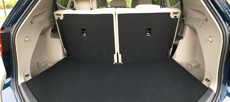 - The great space is seen not only in overall feel and size of the interior, but in the meaningful “extra” spaces, such as on the door trims (see spot in middle, below armrest as well as the unique, raised cup holder design) and the rear cargo cut-outs on both sides.